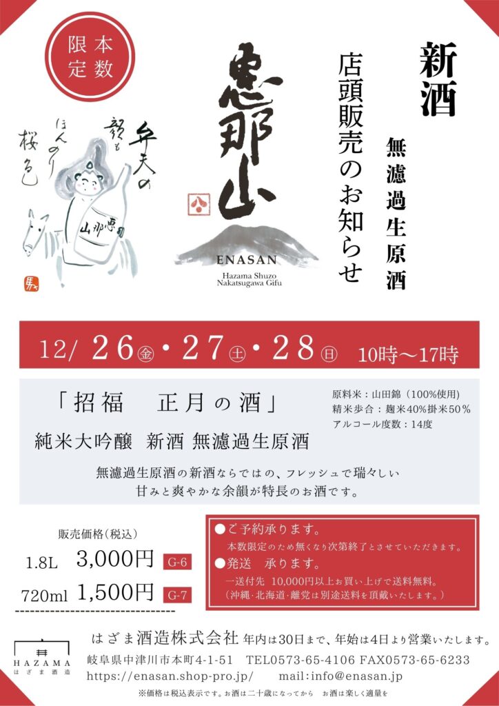 毎年恒例のお正月用の日本酒「恵那山」を12月26日(金)・27日(土)・28日(日) 3日間